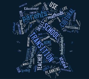 This Tagxedo represents my Literature Review by representing what a person can think of when they reflect on the words Parents, Teachers, School and Transition. These words would not work together correctly if there were no communication. Open lines of communication between school and home lead to students that transition to an adult life with a disability successfully. Communication between home and school allows students to learn “Functional Life Skills” at school and practice them at home.